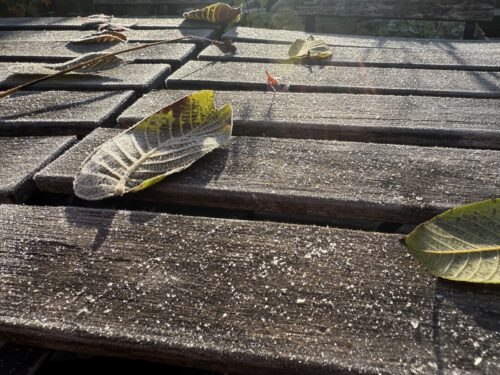 胡桃の落ち葉に生毛のような薄い霜のコントラストがなんとも言えません