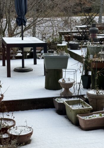 昨夜未明から雪模様の高原でしたが今朝目覚めてみるとうっすらと雪化粧の野乃花の庭です