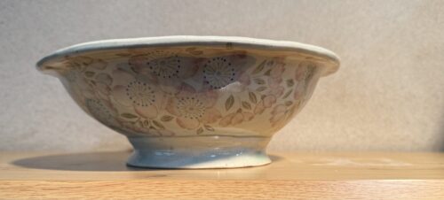九重・小国・内牧・立野を経て南阿蘇へと入る。曇り空で時折ポツリポツリと濡れない程度にそぼ降る雨の中到着する。久木野窯さんとはサラリーマン時代から30年来のお付き合いで野乃花開店以来小さな小さなギャラリーでお客様にも大層喜んでいただきました。また野乃花でも作品を使用させていただいておりました。必ず毎年一度はお伺いしてお気に入りの作品をお預かりしていたのですがそれも今回の返却が最後となりました。展示場を拝見させていただいているうちに髭のマスターの病気がじわじわと発症して今回はマグカップと小さな豆皿を野乃花用にゲットしました。久木野窯さんの作品では御主人の大胆なフォルムと奥様のこれでもかと言うくらいの繊細な絵付けに魅せられました。本当に長い間私たちの我儘にお付き合いいただきまして有難うございました。心より御礼申し上げます。写真加工したのですがちょっと若過ぎましたでしょうか?AIに出会った頃の様にとお願いをしたらこうなりました。因みに髭のマスターと明美シェフの間にカメラマン正人の顔らしきものが半分映っていますがAIは棚の上の桜の大鉢を人の顔と判断した様です。面白いのでこのまま掲載してみました。桜の大鉢は下記の綺麗な鉢ですので併せて載せますね。